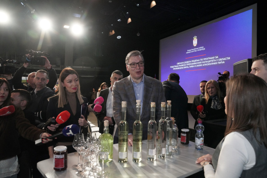 "Zato što neće za druge biti prostora. Prosto moramo da obezbedimo što je moguće veći izvoz u Kinu i onda će vinarska industrija moći da opstane", rekao je Vučić u Ložionici tokom obilaska štandova pred svečano uručenje rešenja u okviru programa za podsticaj razvoja prerađivačkih kapaciteta u oblasti proizvodnje vina, piva i jakih alkoholnih pića u 2025. godini.