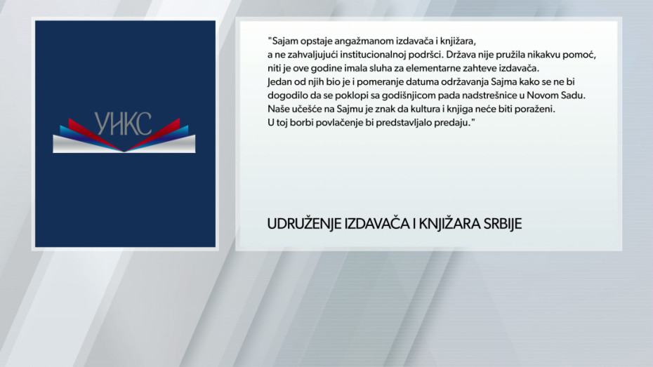 "Sajam opstaje angažmanom izdavača i knjižara, a ne zahvaljujući institucionalnoj podršci. Država nije pružila nikakvu pomoć, niti je ove godine imala sluha za elementarne zahteve izdavača. Jedan od njih bio je i pomeranje datuma održavanja Sajma kako se ne bi dogodilo da se poklopi sa godišnjicom pada nadstrešnice u Novom Sadu. Naše učešće na Sajmu je znak da kultura i knjiga neće biti poraženi. U toj borbi povlačenje bi predstavljalo predaju", istakli su iz Udruženja izdavača i knjižara Srbije.