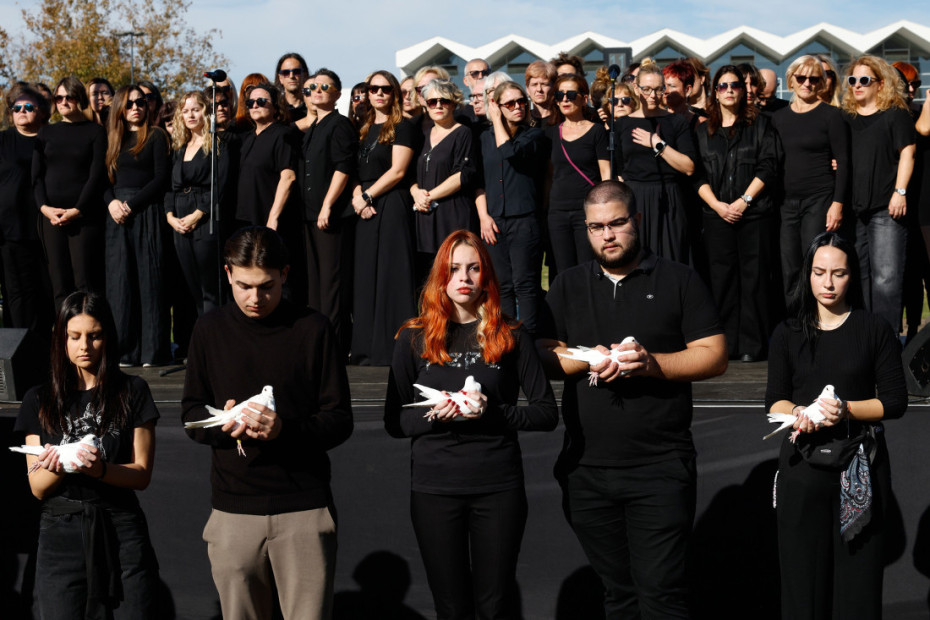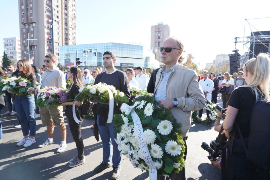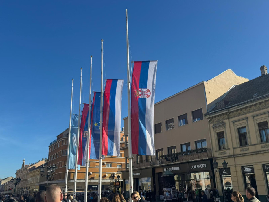 Hiljade građana stajalo je u tišini, gde se održava centralni komemorativni skup. Nakon 16 minuta tišine, završene sa "Slava im" i aplauzom, predstavnici zborova građana Novog Sada i Dijana Hrka, majka jednog od poginulih, prvi su položili vence u blizini mesta tragedije.