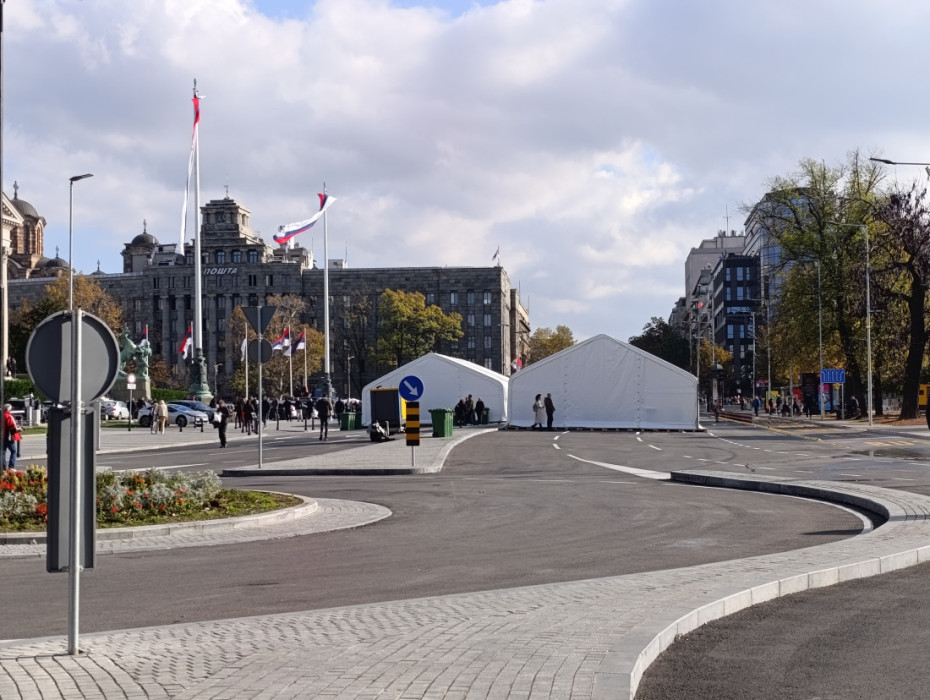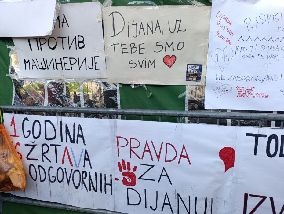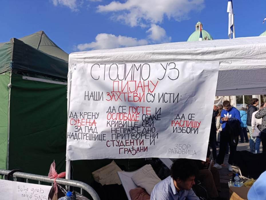 U blizini zgrade parlamenta, na raskrsnici Takovske i Bulevara kralja Aleksandra, nalazi se šator u kojemod nedelje boravi Dijana Hrka.