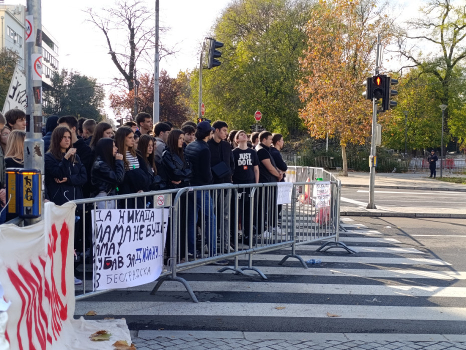 Građani su se okupili na raskrsnici Bulevara kralja Aleksandra i Takovske ulice kako bi pružili podršku Dijani Hrki, majki Stefana Hrke koji je poginuo u padu nadstrešnice na Železničkoj stanici u Novom Sadu, koja od nedelje štrajkuje glađu.