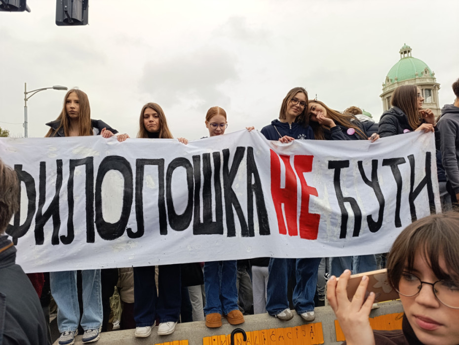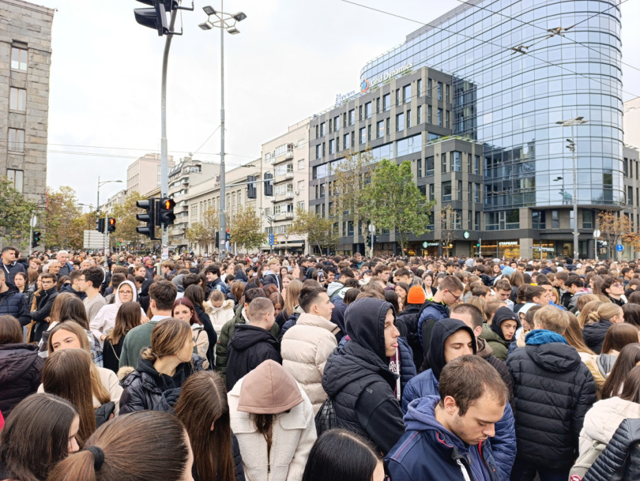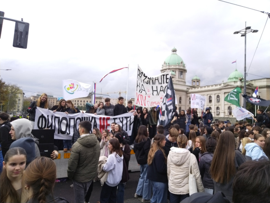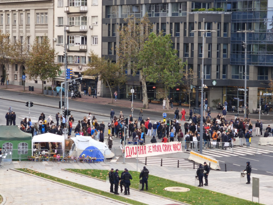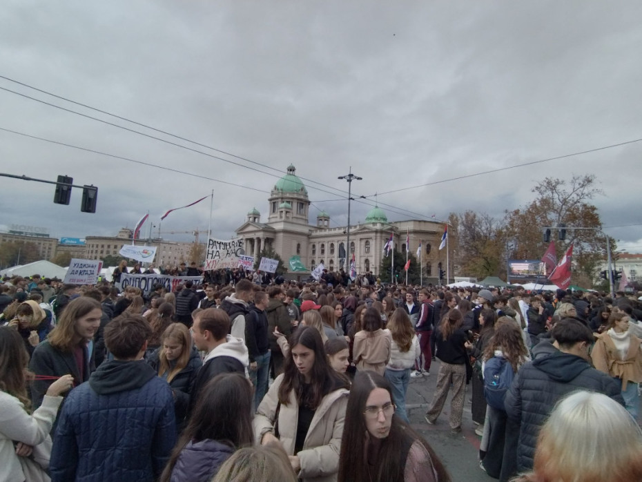 Ispred Doma Narodne skupštine je mirno, srednjoškolci su došli kako bi podržali Dijanu Hrku, tako da je saobraćaj na uglu Bulevara kralja Aleksandra i Takovske ulice u prekidu. Na platou pred skupštinskim zdanjem prisutni su pripadnici MUP koji obezbeđuju prostor, incidenata nema.