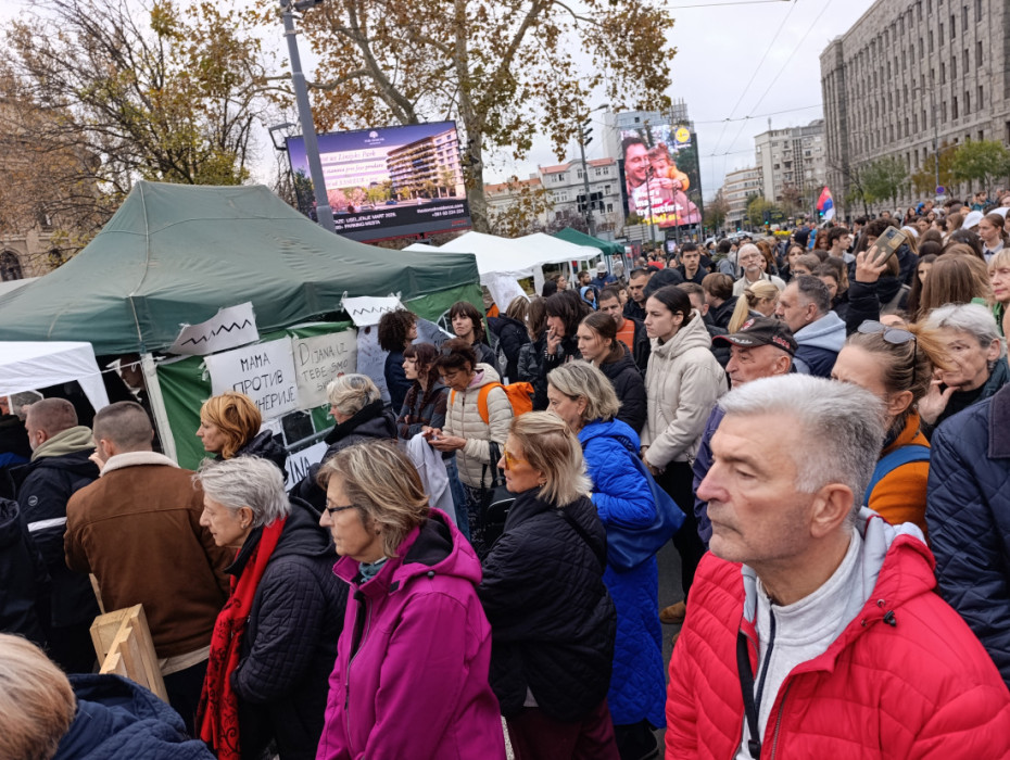 Na prostoru ispred Doma Narodne skupštine bilo je mirno i u četvrtak, iako je bilo bučno zbog muzike koja se sve vreme čula sa razglasa postavljenog ispred šatora, što je izazvalo negodovanje okupljenih građana koji pružaju podršku Dijani Hrki.