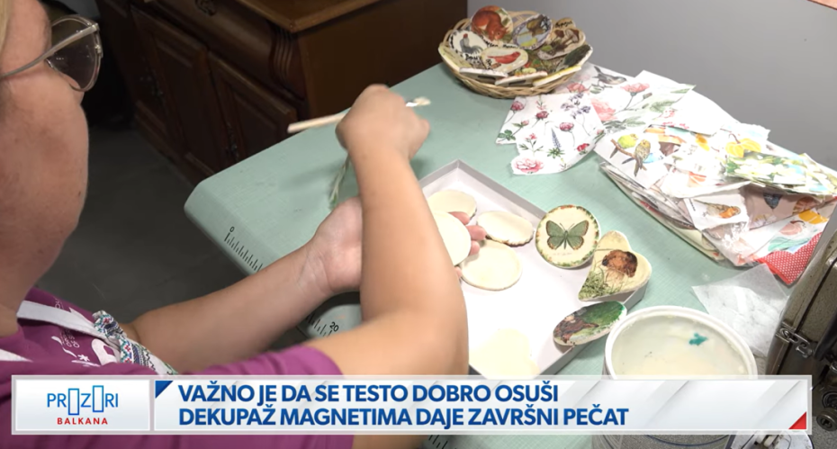 "Za izradu ovih neobičnih magneta, važno je da se testo dobro osuši najmanje 15 dana, a onda ih obrađuje u dekupaž tehnici i motivima iz prirode. To su sve uglavnom motivi sela, znači to su sve životinje, voće, povrće, pečurke, samo te motive radim", otkrila je Aleksandra i dodala da su posetioci jako zainteresovani da kupe ekomagnete kao suvenire.