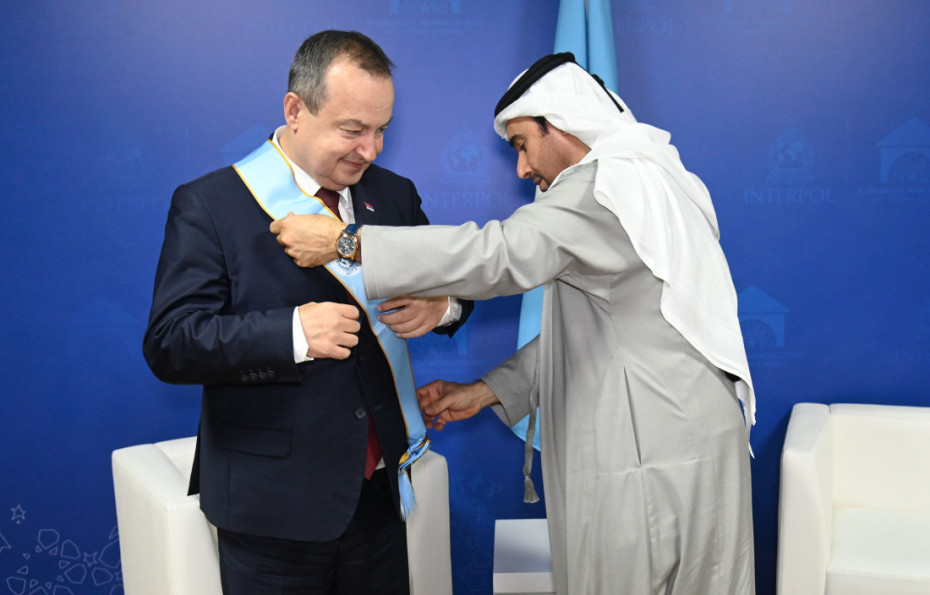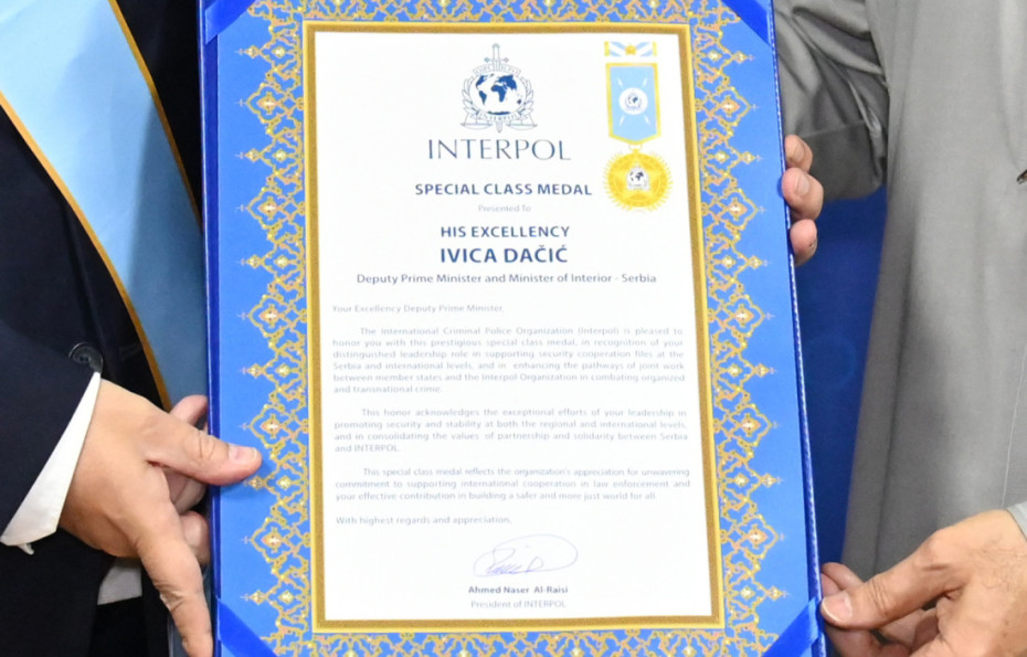 "Medalja posebnog ranga predstavlja izraz iskrene zahvalnosti ove organizacije za Vašu nepokolebljivu posvećenost unapređenju međunarodne saradnje u oblasti sprovođenja zakona i za Vaš delotvoran doprinos izgradnji bezbednijeg i pravednijeg sveta za sve", navodi se u priznanju Interpola koje je ministru Dačiću uručio predsednik Interpola Ahmed Naser Al-Raisi.
