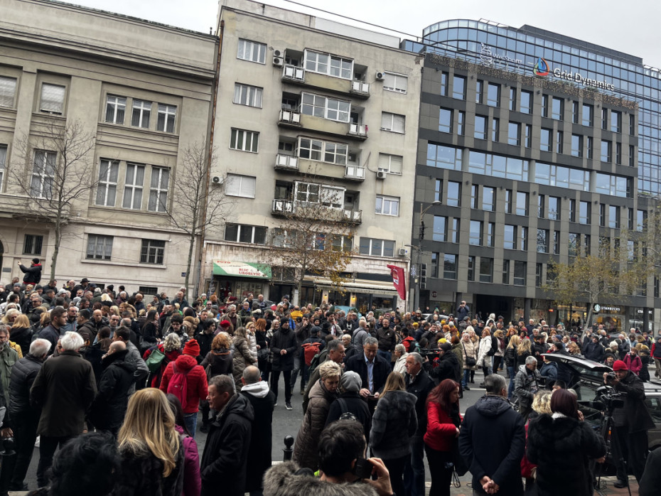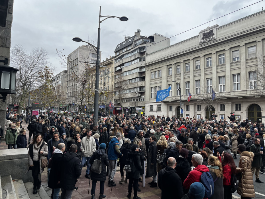 Protest se, kako je najavljeno, održava zbog toga što tužiteljki iz Prvog osnovnog javnog tužilaštva u Beogradu nije bili dozvoljeno da izvrši uviđaj posle incidenta u šatorskom naselju ispred Skupštine.