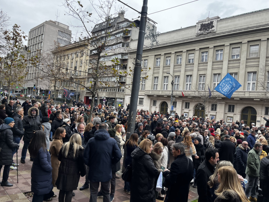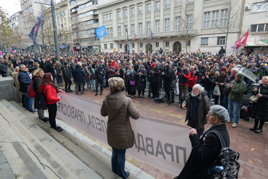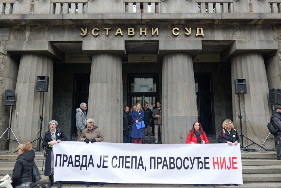 Grupa sudija i tužilaca iz cele Srbije okupila se ispred Ustavnog suda na protestu protiv političkih pritisaka na pravosuđe.