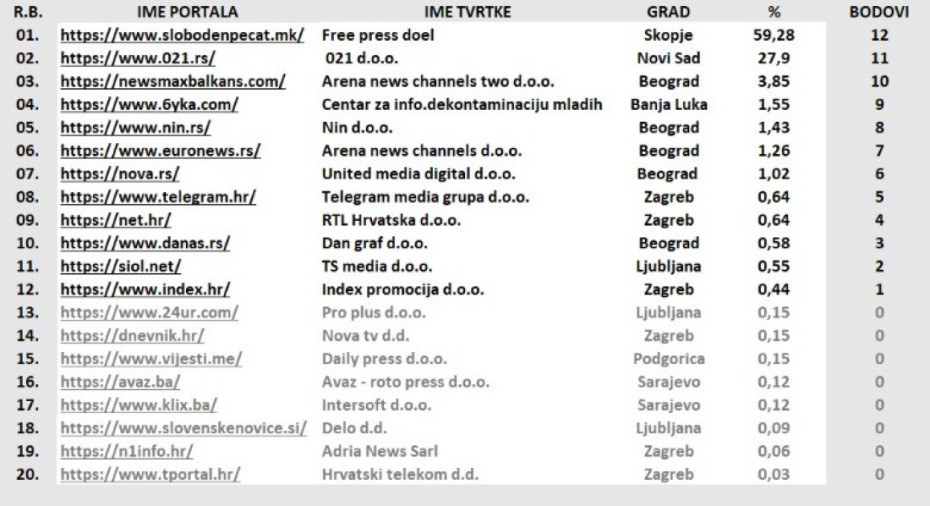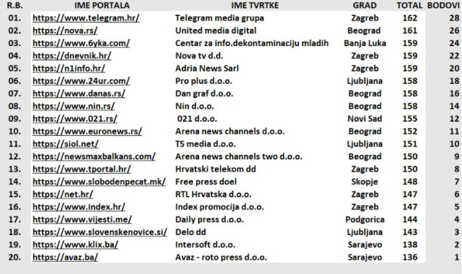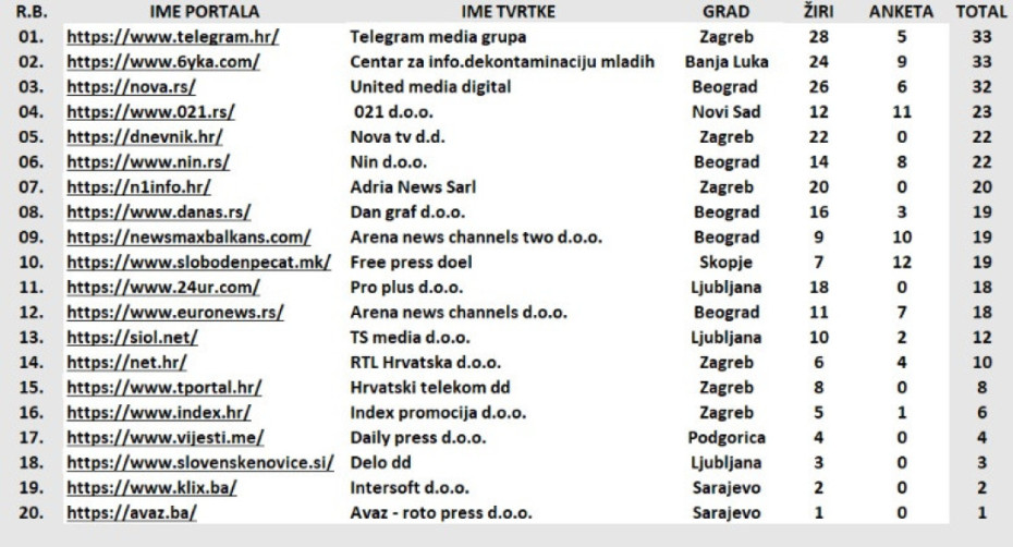 U izboru je učestvovalo 20 news portala iz Slovenije, Hrvatske, Bosne i Hercegovine, Srbije, Crne Gore i Severne Makedonije.