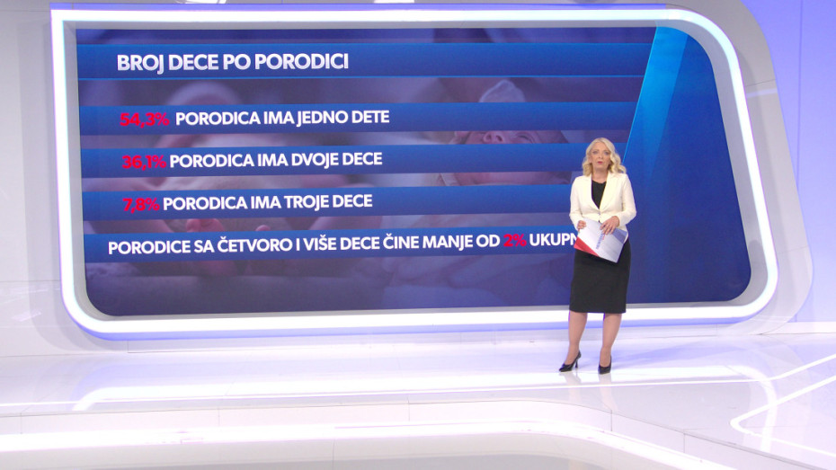 U Srbiji 54,3 odsto porodica ima jedno dete. Dvoje dece skoro pa duplo manje od toga, 36,1 odsto porodica ima dvoje dece. Samo 7,8 porodica da decom ima troje, a četvoro i više dece izuzetno, izuzetno malo - manje od dva odsto porodica.