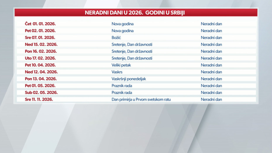 Koji su neradni dani i državni praznici, u Srbiji propisuje zakon. kada se saberu, Nova godina, koja se neradno slavi dva dana, Božić, Dan državnosti, Praznik rada, Dan primirja i Vaskrs, neradnih dana je 13.
