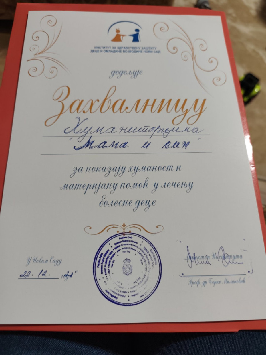 "U Dečju bolnicu u Novom Sadu ove godine nismo smeli da uđemo i lično podelimo poklone jer vlada epidemija gripa, tako da smo paketiće predali glavnoj sestri. Odatle je Marek dobio i zahvalnicu. Lično smo odneli i podelili paketiće deci u Udruženju u Bačkom Petrovcu. Mareku su oči bile pune suza kad im je davao paketiće, deca su ga grlila. Odneli smo i Udruženju "Kulpin" gde su deca sa posebnim potrebama i u Bačkoj Palanci. To se rečima ne može objasniti koliko su oni srećni, a nama je puno srce", rekla nam je Marekova mama.