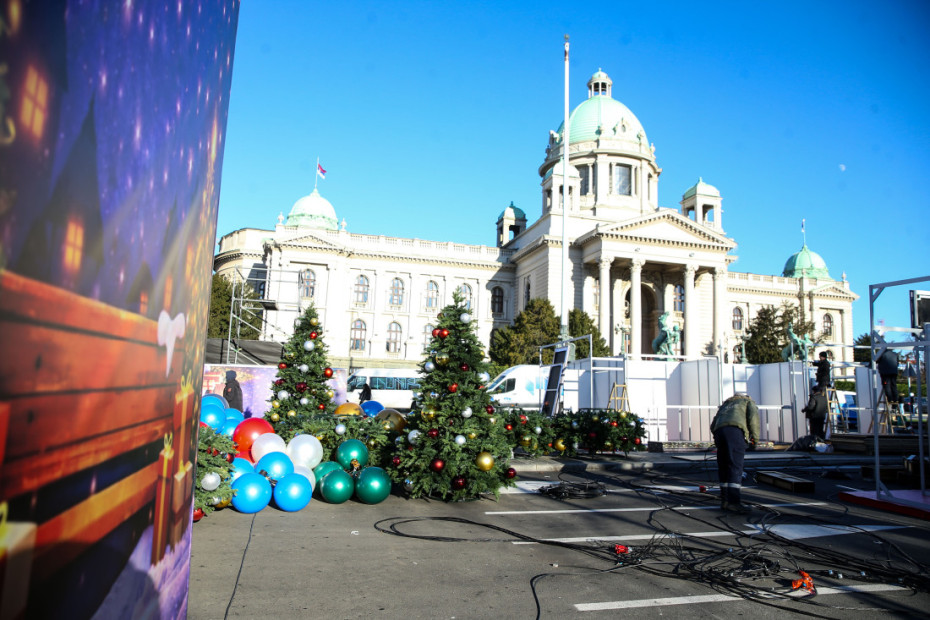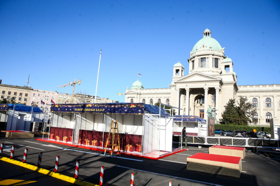 Ispred Doma Narodne Skupštine Srbije postavljeni su štandovi sa natpisima "Novogodišnji bazar", a u toku je unošenje okićenih jelki.