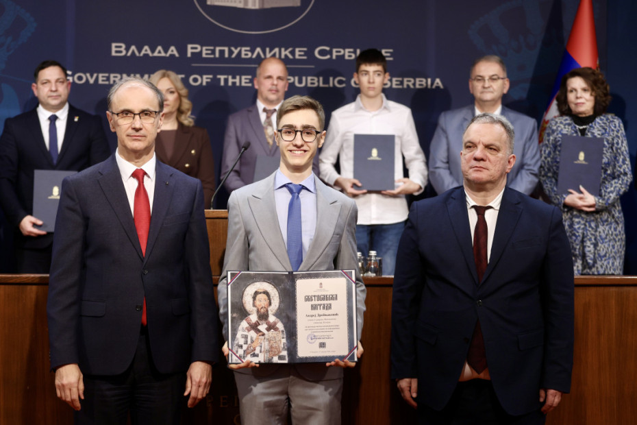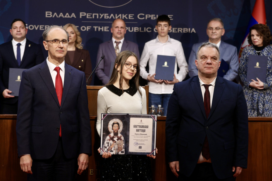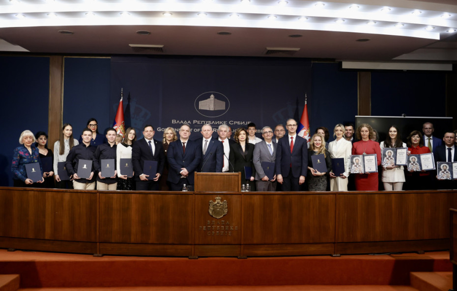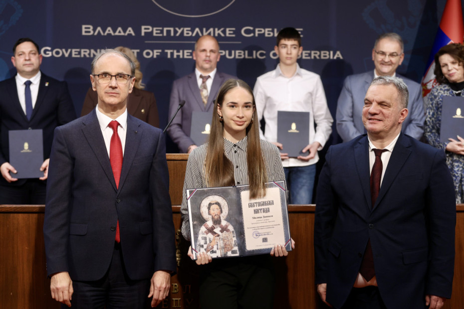 Predsednik Vlade Srbije Đuro Macut i ministar prosvete Vuk Dejan Stanković uručili su na ceremoniji u Vladi Srbije, 31 Svetosavsku nagradu pojedincima i institucijama za postignute izuzetne rezultate u oblasti obrazovanja i vaspitanja za 2025. godinu.