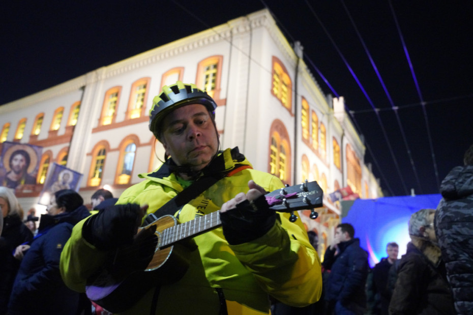 Građani nose zastave Srbije i zastave na kojima su oslikana lica svetaca.