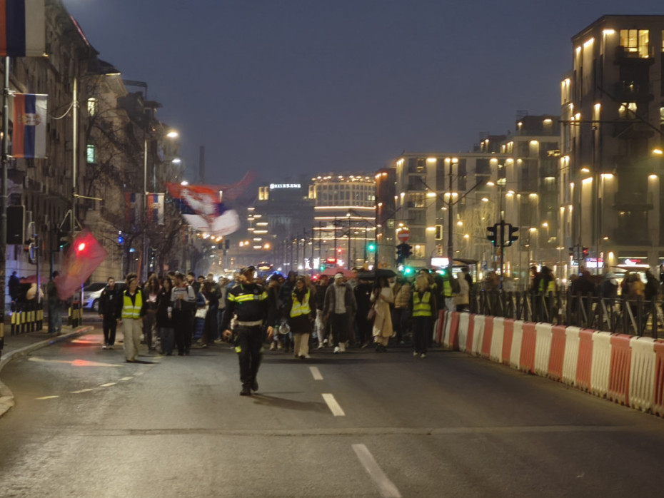 Učesnici protesta uzvikuju "pumpaj", "ne damo Mariju" i "uprava napolje" i prave buku pištaljkama, dok im građani iz automobila pružaju podršku sirenama.
