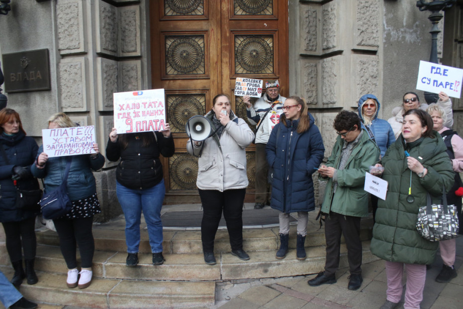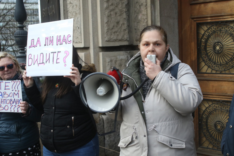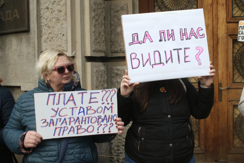 Protest pod sloganom "Halo, tata, gde je naših devet plata" organizovao je sindikat "Opstanak", a okupljeni su sa pištaljkama pravili buku ispred zgrade Vlade Srbije.