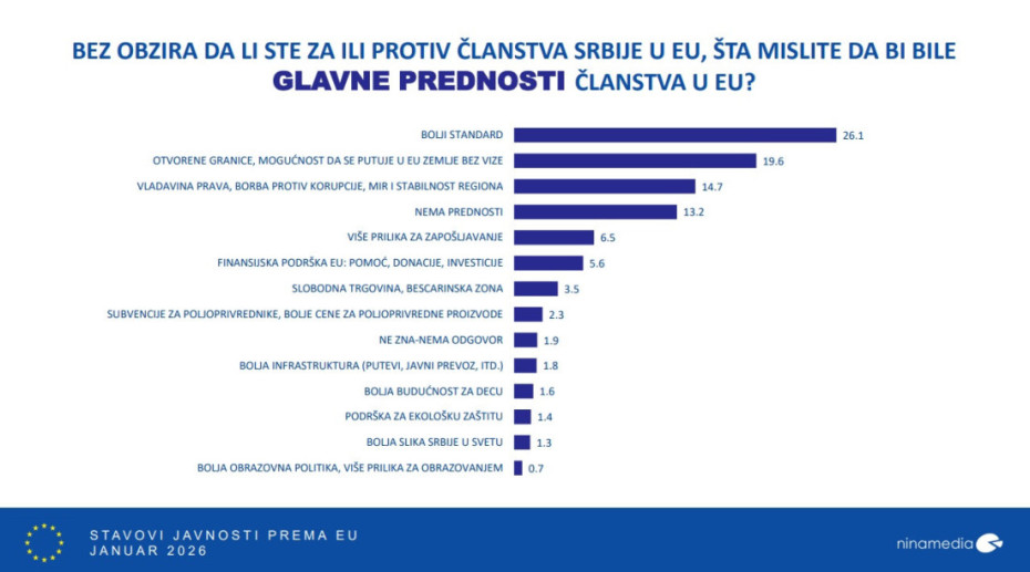 Na pitanje o prednostima članstva u EU, građani najčešće povezuju EU sa višim životnim standardom, slobodom kretanja, vladavinom prava i borbom protiv korupcije. Korupcija, organizovani kriminal i ekonomski izazovi se istovremeno identifikuju kao tri najhitnija problema sa kojima se srpsko društvo danas suočava, a to su ujedno oblasti u kojima članstvo u EU i reforme povezane sa procesom pristupanja nude konkretna i dugoročna rešenja.