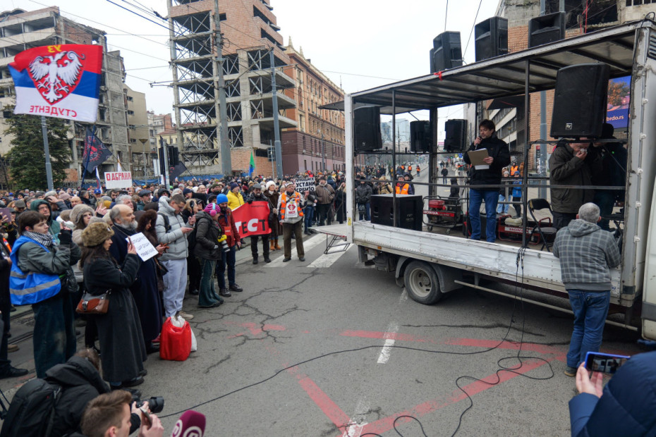 Prethodno je saobraćaj u Nemanjinoj ulici bio zaustavljen, dok prisutni redari u narandžastim marker-prslucima regulisali kretanje kolone i učesnika protesta.