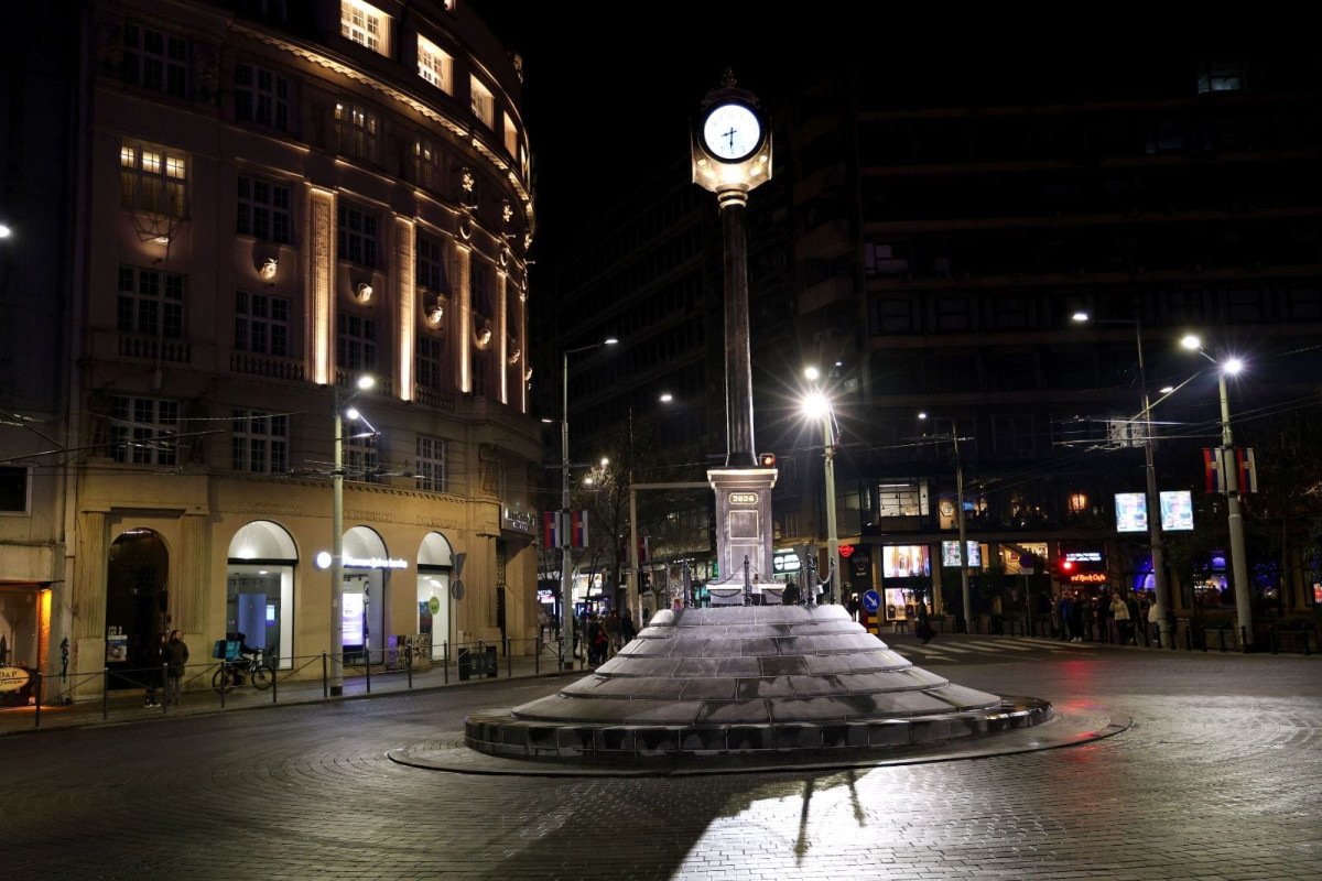 Novi sat, visok devet metara i težak oko sedam i po tona, postavljen je u toku noći u središte kružnog toka na Trgu republike u Beogradu i odmah je pušten u rad.