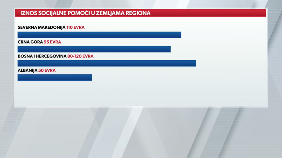 U Bosni i Hercegovini iznos socijalne pomoć je između 80 i 120 evra, a u Albaniji je 50 evra.