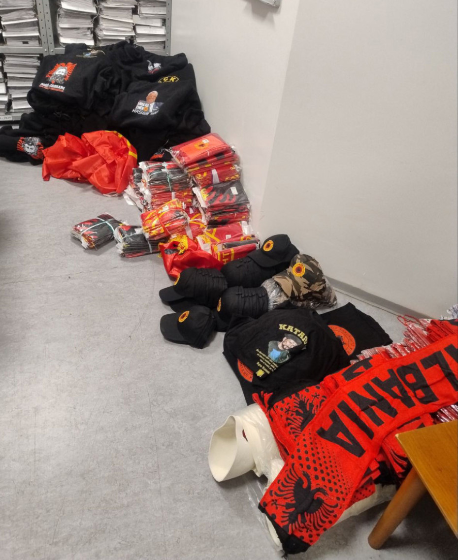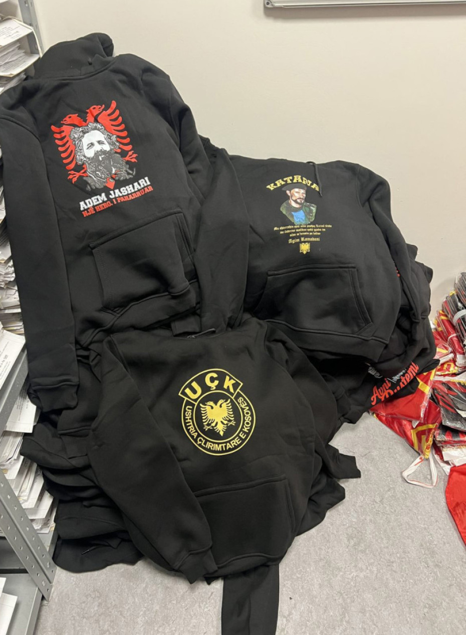 Kako je saopšteno iz MUP Srbije, policija je na administrativnom prelazu Merdare pregledom kombija marke "mercedes", kojim je iz pravca Kosova i Metohije upravljao osumnjičeni, pronašla pet torbi u kojima su se nalazile 22 majice, 244 zastave i 86 kačketa sa natpisom UČK, 65 dukserica sa likom Agima Ramadanija, 58 šalova sa grbom Albanije, kao i 92 kape "ćelepoši".