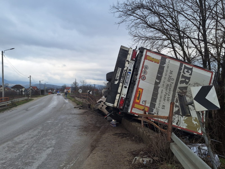 U nezgodi nije bilo povređenih, ali je na kamionu pričinjena znatna materijalna šteta, dok je deo tereta ispao iz vozila i rasut pored puta.