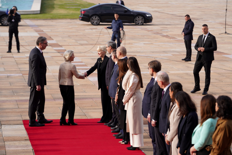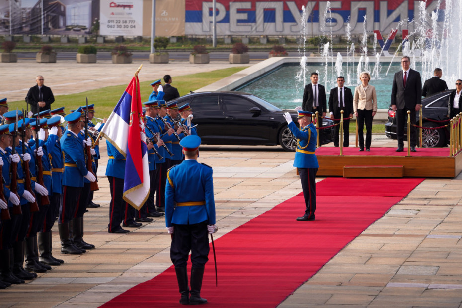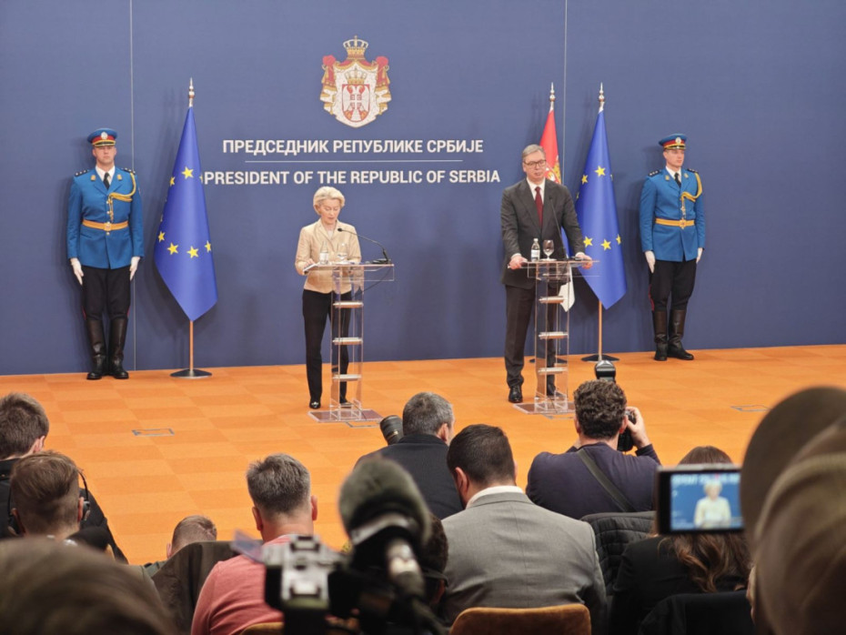 Predsednik Aleksandar Vučić dočekao je ispred Palate Srbija predsednicu Evropske komisije Ursulu fon der Lajen, koja boravi u zvaničnoj poseti Srbiji. Oni su zatim otpočeli tet-a-tet sastanak, a onda i održali zajedničku konferenciju za medije.