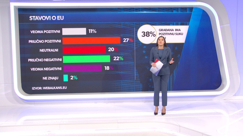 Dok 40 odsto građana ima prilično ili veoma negativan stav prema EU, 38 odsto izražava prilično ili veoma pozitivan stav, što ukazuje na podeljenost javnosti.