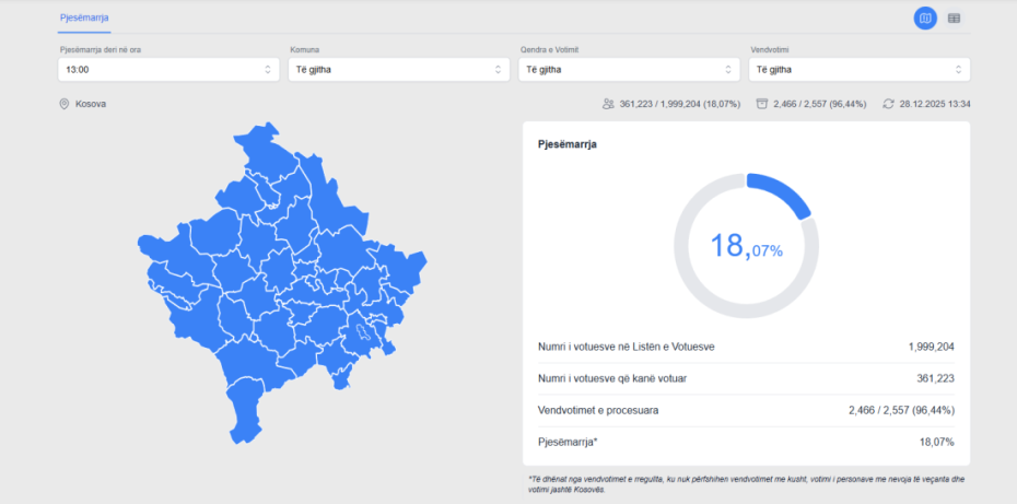 Prema podacima Centralne izborne komisije, u Kosovskoj Mitrovici do 13 časova glasalo je 26,67 odsto upisanih birača, u Leposaviću 16,16 odsto, Zubinom Potoku 28,1 odsto, u Zvečanu 21,5 odsto, u Gračanici 23,22 odsto, u Novom Brdu 30,81 odsto, u Ranilugu 33,28 odsto, u Patrešu 19,95 odsto, u Klokotu 15,92 odsto, a u Štrpcu 25,26 odsto.