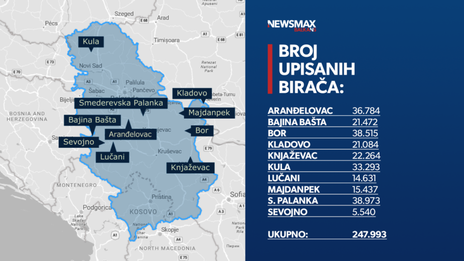 Podaci Ministarstva za državnu upravu i lokalnu samoupravu objavljeni 2. marta pokazuju da je najviše građana upisano u birački spisak u opštini Smederevska Palanka - 38.973, dok je najmanje birača u užičkoj gradskoj opštini Sevojno - svega 5.540.