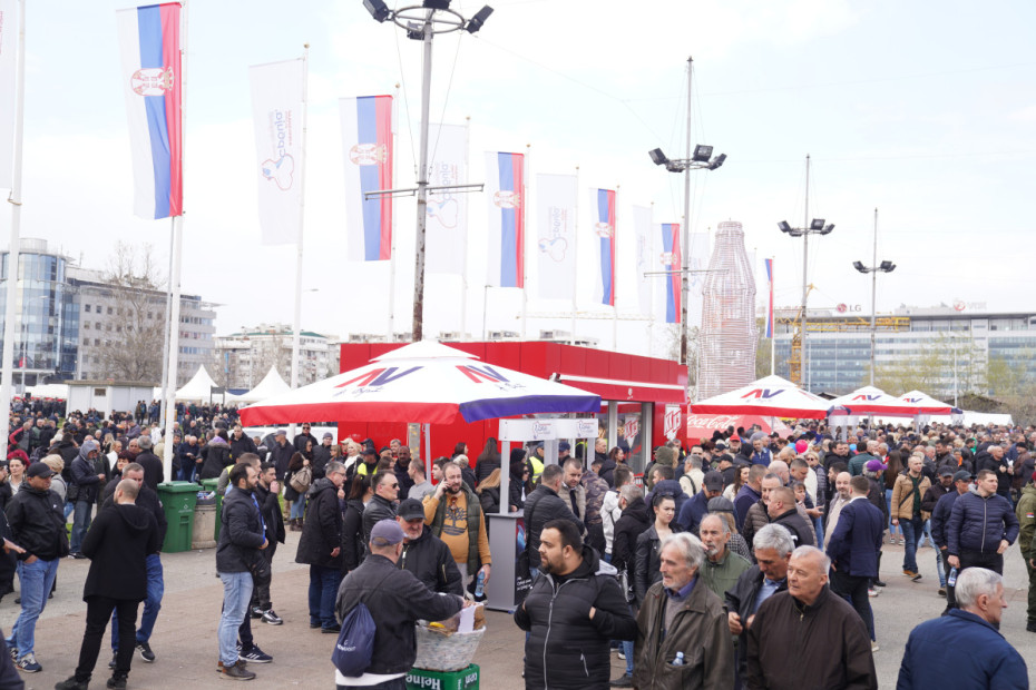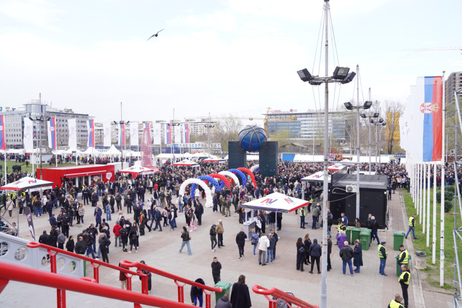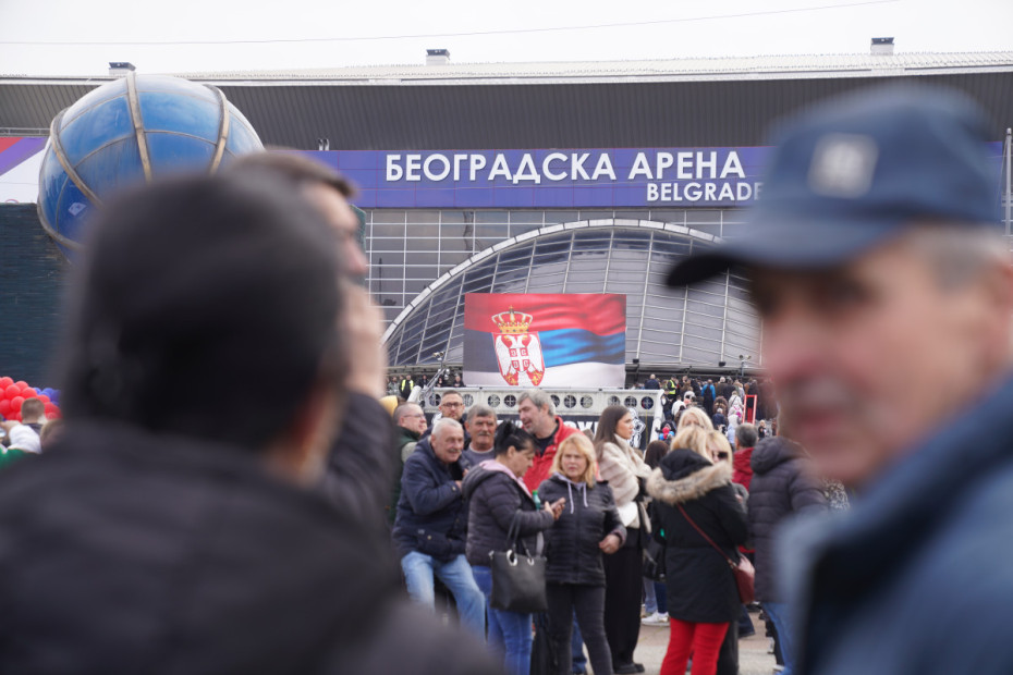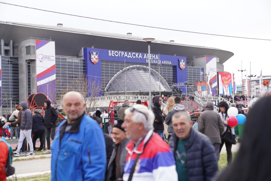 Ispred Arene okupio se veliki broj građana koji drže zastave Srbije i SNS, a ispred hale su postavljeni suncobrani sa inicijalima predsednika Srbije, kao i baloni u bojama srpske zastave.