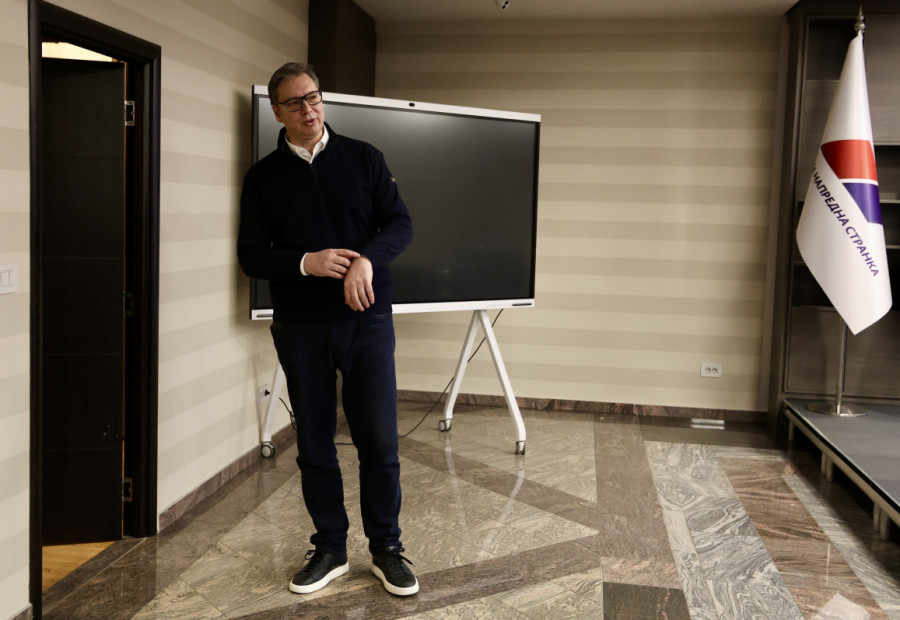 "Što volite da nam dodajete procente. Polako. Biće neizvesna i teška borba, obratiću vam se za sat vremena, u Kladovu je najbolje", rekao je Vučić kratko okupljenima u centrali SNS na Novom Beogradu.