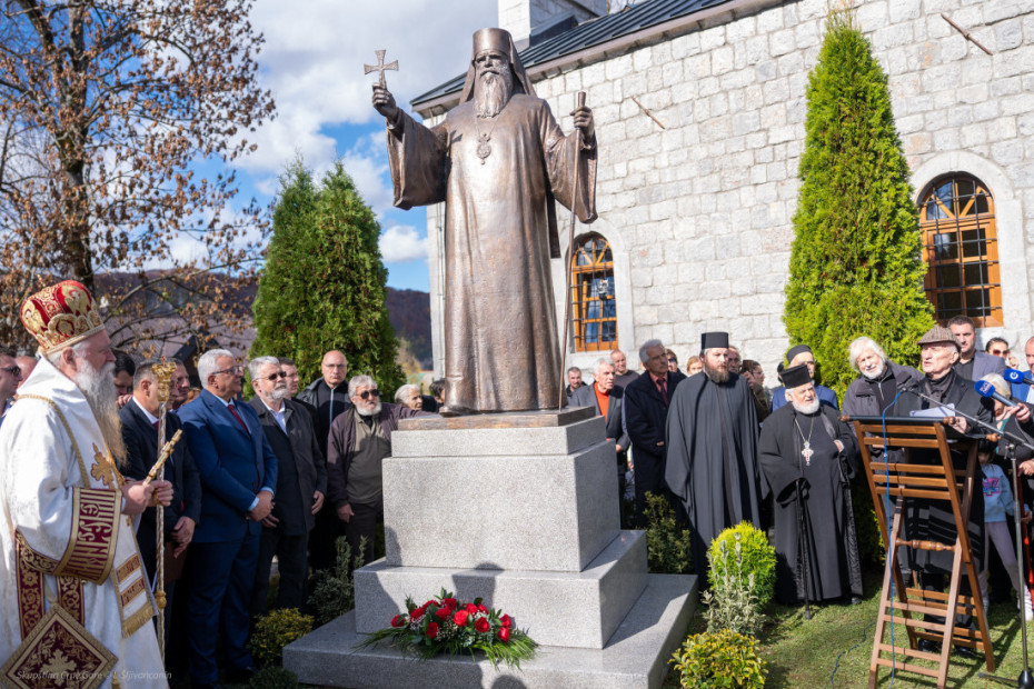 Bećković je istakao da je mitropolit Amfilohije prvi duhovnik kome je Kolašin podigao spomenik, naglašavajući njegovu žrtvu i ljubav i vernost Bogu i narodu.