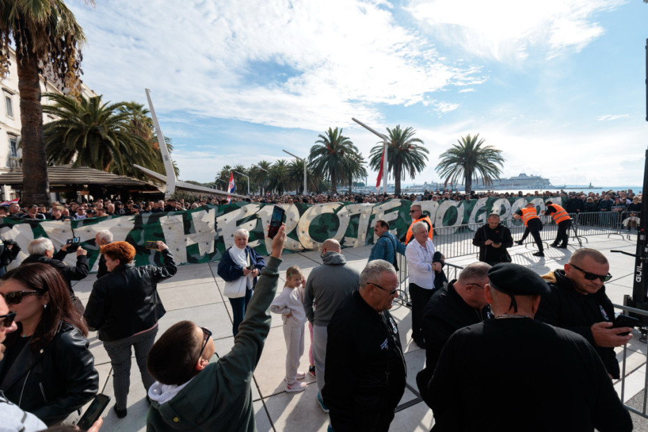 Između puštanja sa razglasa pesama Tompsona, Miroslava Škore i Jure Stublića, okupljeni su skandirali "u boj u boj za narod svoj", "Vukovar" i "Torcida, Torcida", pre nego što se na skupu obratio sekretar Torcide, Frane Lekić, koji je podsetio na događaj od pre 80 godina, kada je Splićanin Frane Penta skinuo jugoslovensku zastavu s Marjana i zbog toga završio u zatvoru, gdje je bio mučen i zlostavljan.