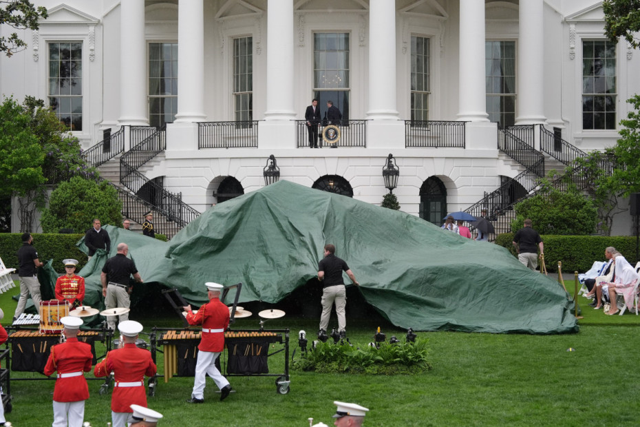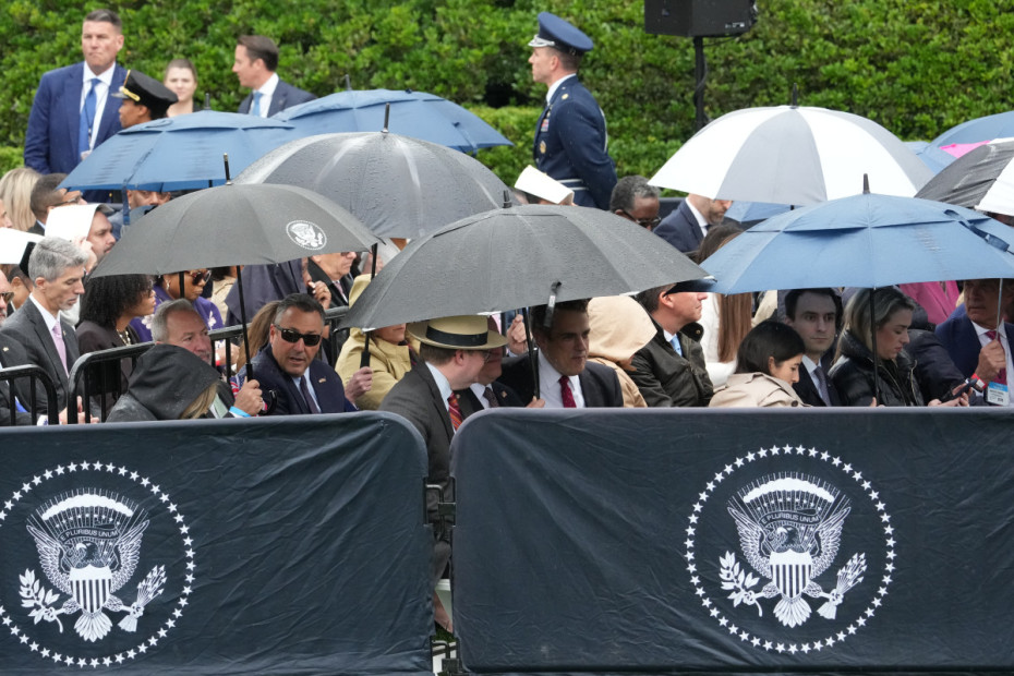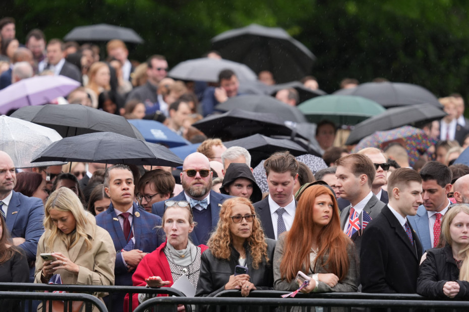 Posetioci okupljeni na Južnom travnjaku Bele kuće čekaju na kiši početak ceremonije dočeka kralja i kraljice Kamile.