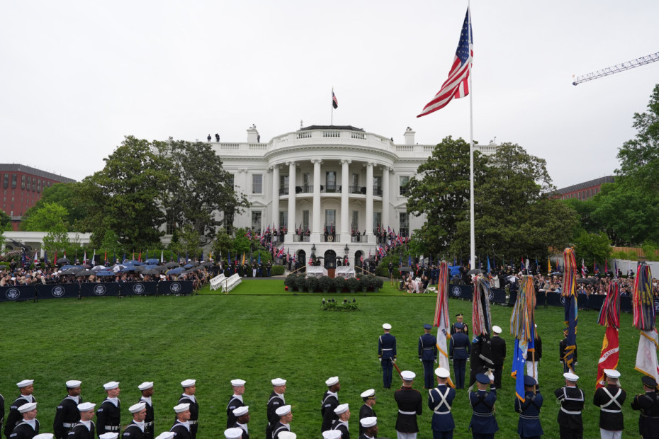 Vojna parada formira se na travnjaku ispred Bele kuće, u uslovima uporne kiše koja prati čitav događaj.